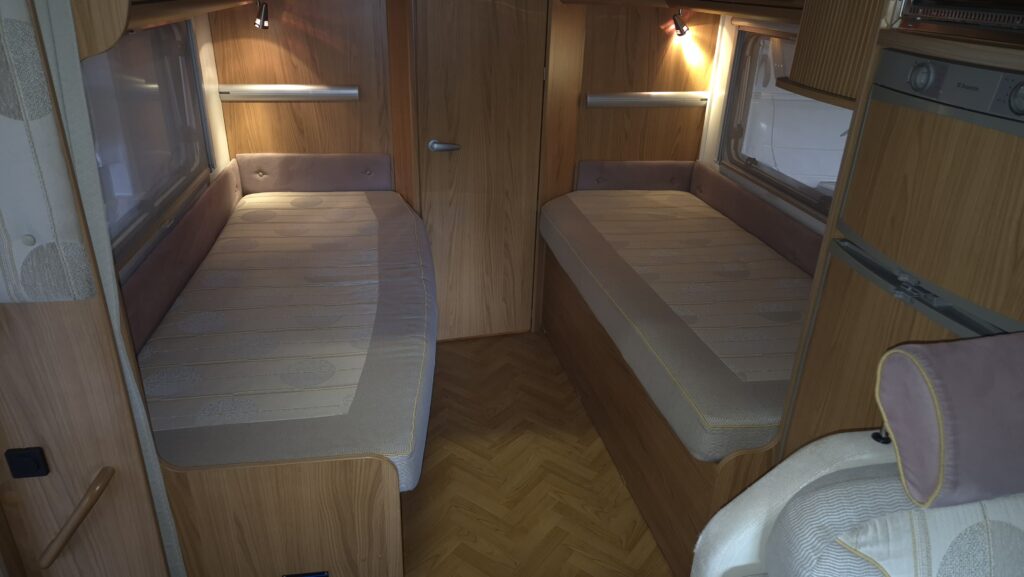 Voor een gezellige zitgroep met draaibare stoelen, 2 enkele bedden met bergruimte eronder, achterin cassette toilet met wastafel en aparte douche, ringverwarming, boiler,bearlock op versnellingspook ( korting op verzekering)zonnepaneel, dakairco met afstandsbediening, elektrische ramen en spiegels, motorairco,uitdraailuifel, fietsendrager met liftsysteem, apk 04-2026.
