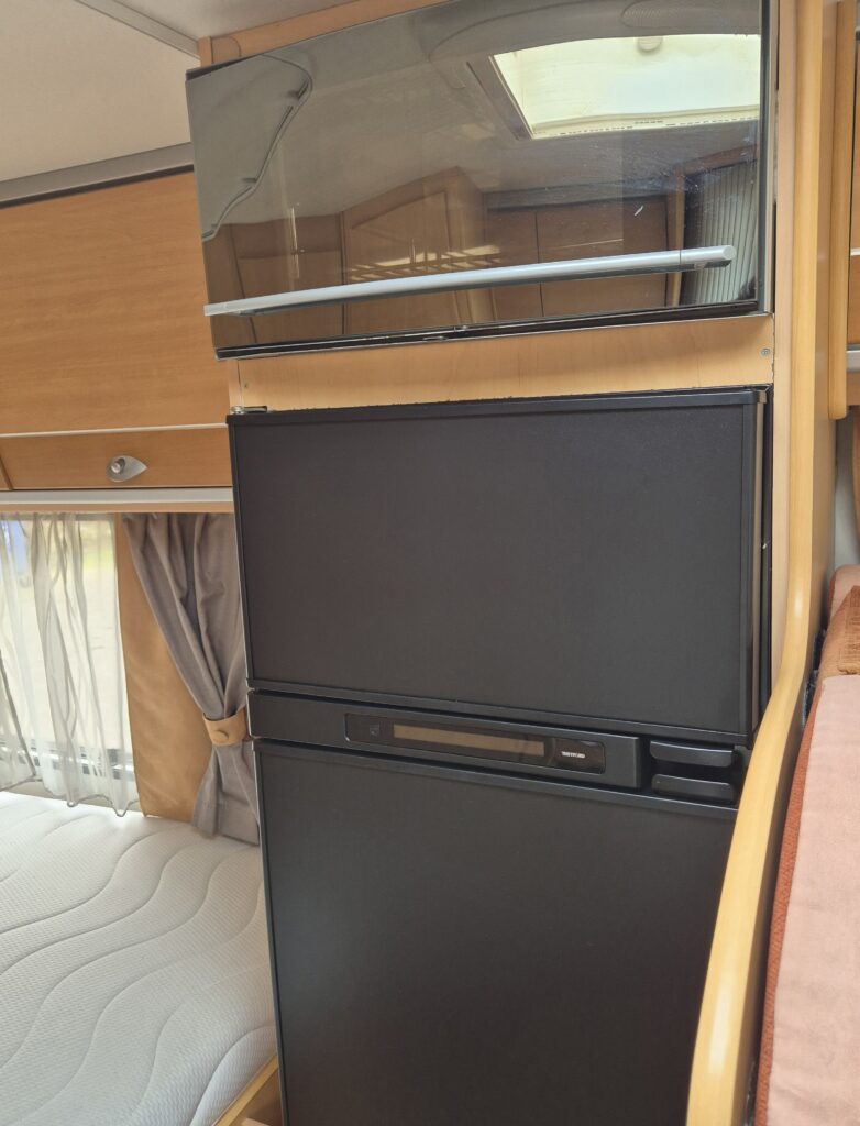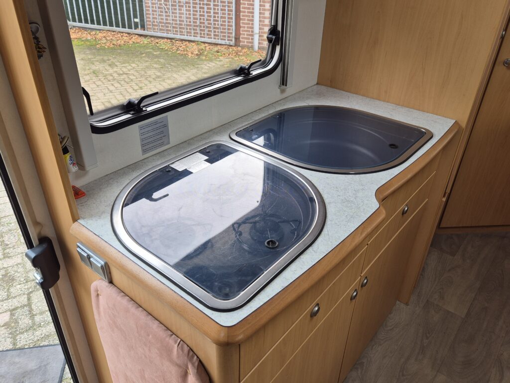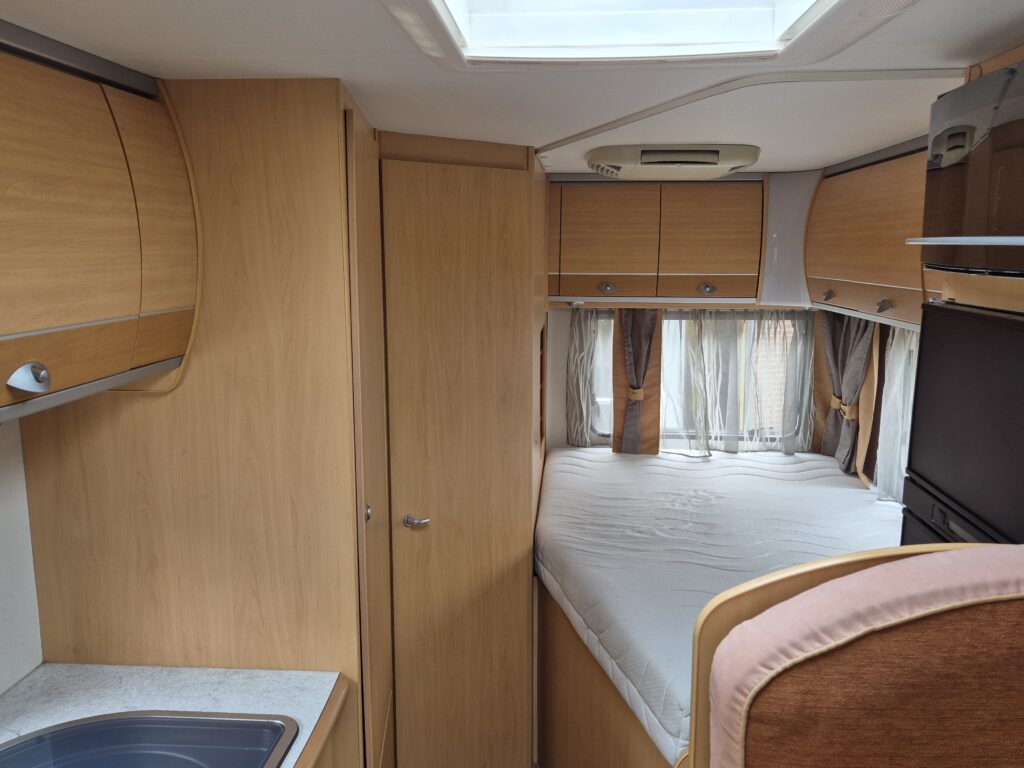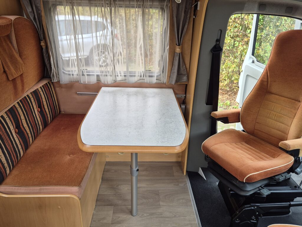 - Gezellige zitgroep voorin met draaibare stoelen en armleuningen, eenvoudig om te bouwen tot een éénpersoonsbed. - Achterin een comfortabel Frans bed. - Complete sanitaire ruimte met cassettetoilet en wastafel; de douche is aantoonbaar nooit gebruikt. - De keuken is uitgerust met een één jaar oude koelkast (220V/12V/gas) inclusief vriesvak.Luxe en functionaliteit: