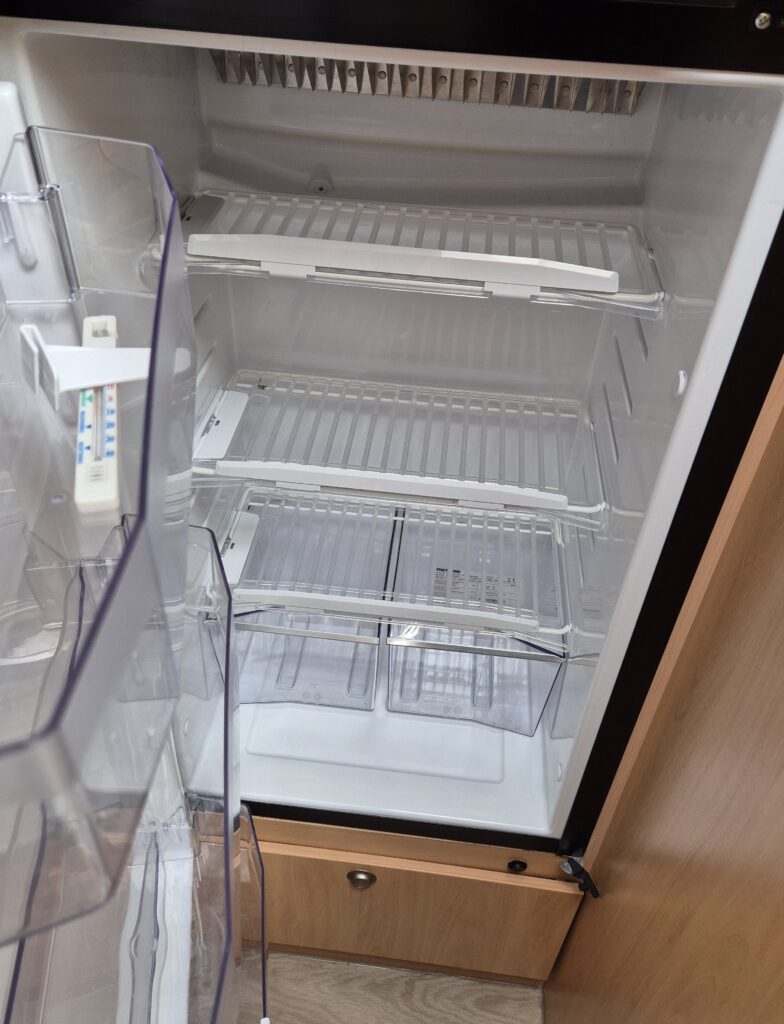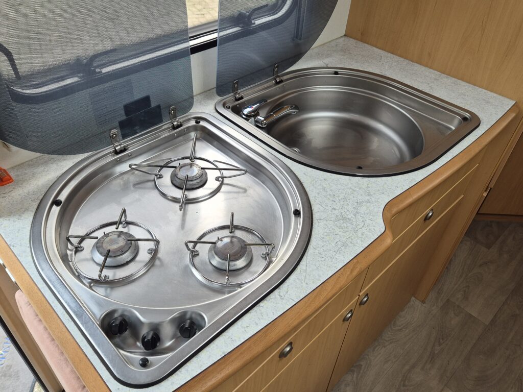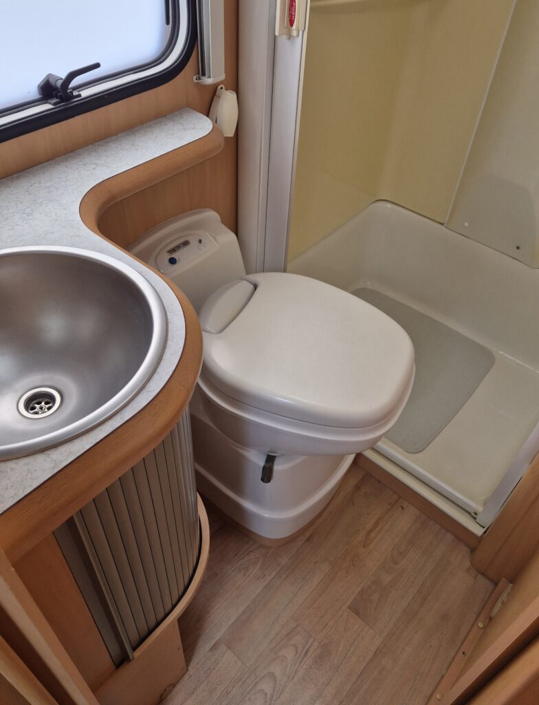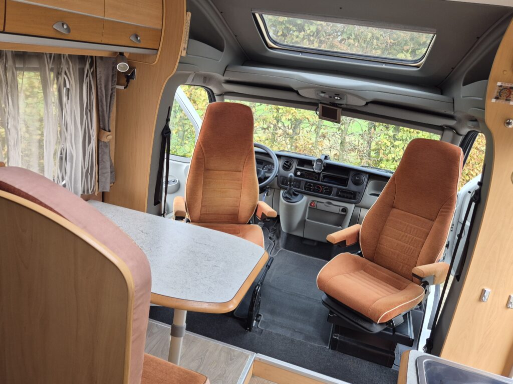 - Gezellige zitgroep voorin met draaibare stoelen en armleuningen, eenvoudig om te bouwen tot een éénpersoonsbed. - Achterin een comfortabel Frans bed. - Complete sanitaire ruimte met cassettetoilet en wastafel; de douche is aantoonbaar nooit gebruikt. - De keuken is uitgerust met een één jaar oude koelkast (220V/12V/gas) inclusief vriesvak.Luxe en functionaliteit: